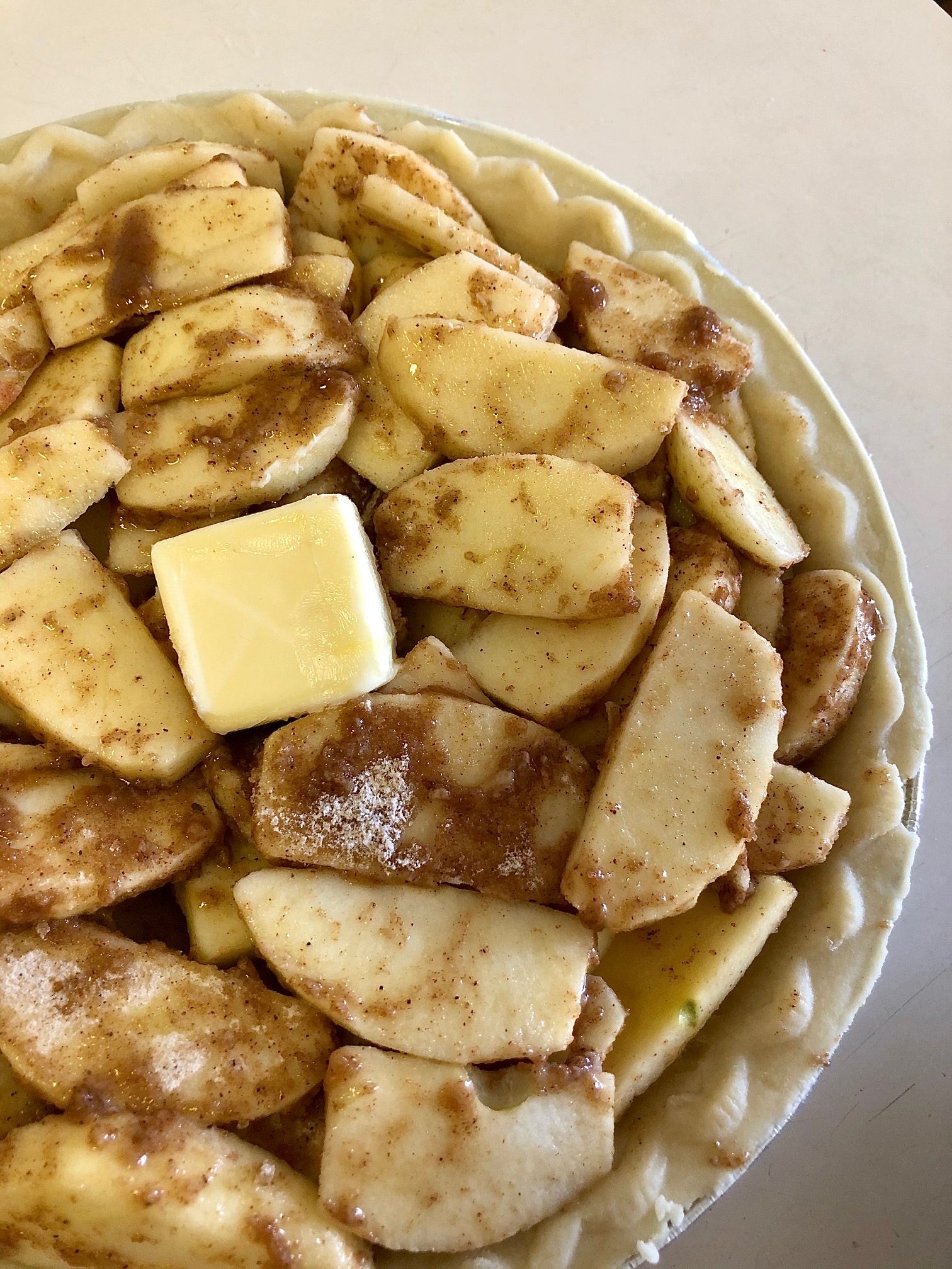 - Line a 9-inch pie plate with your bottom crust. Fill it with your apple mixture and add the butter on top of your apples in the centre.