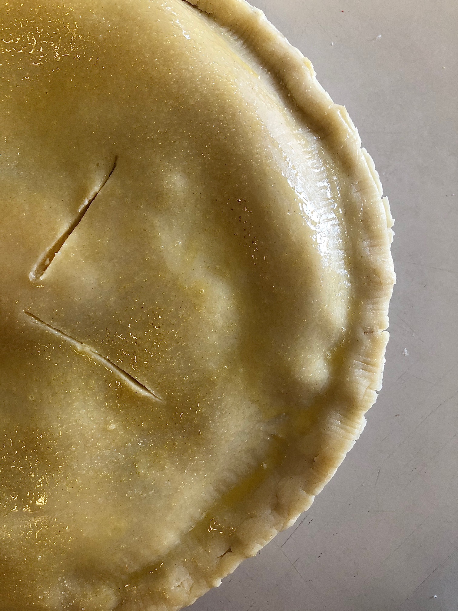 - Add the top layer crust over the filling and press down on the edges to ensure they’re sealed to the bottom crust’s edges. Cut four slits into the top crust, as shown in the photos above.
