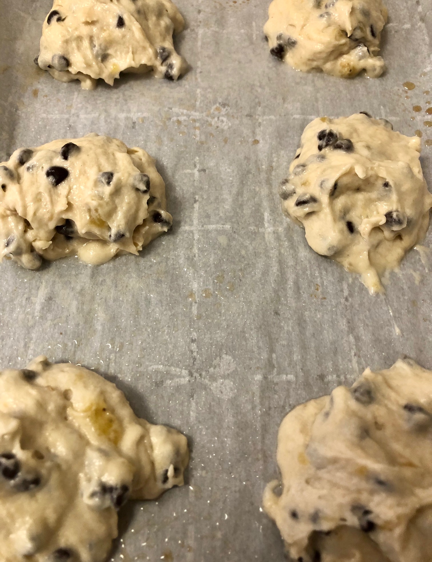 - Using an ice cream scooper to scoop each spoonful of batter for each cookie, placing them about 2 inches apart on the baking sheet.