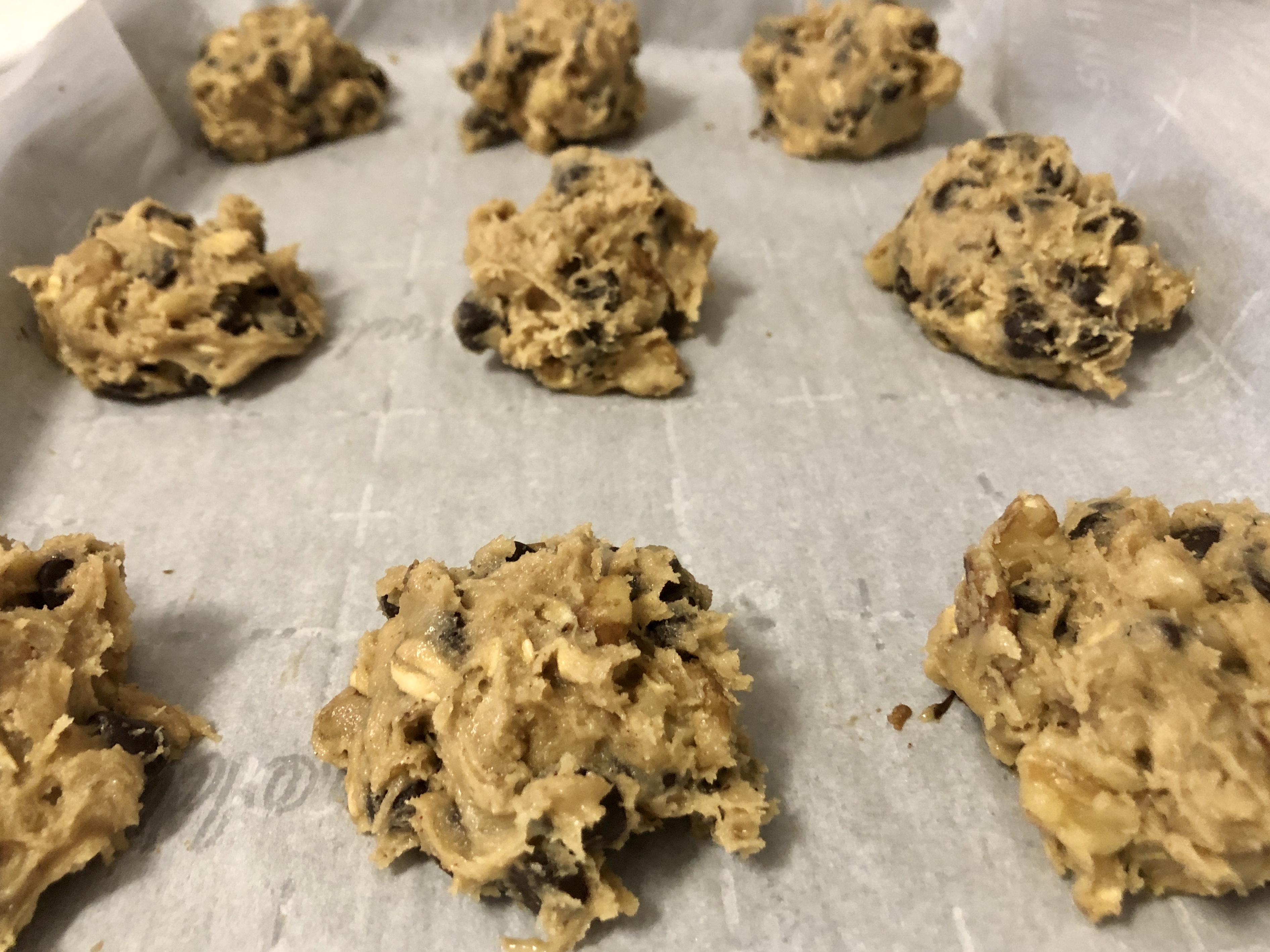 - Use an ice cream scooper to portion the dough onto a baking sheet lined with parchment paper. Spread each portion about 2 inches apart, as the cookies will expand in the oven.