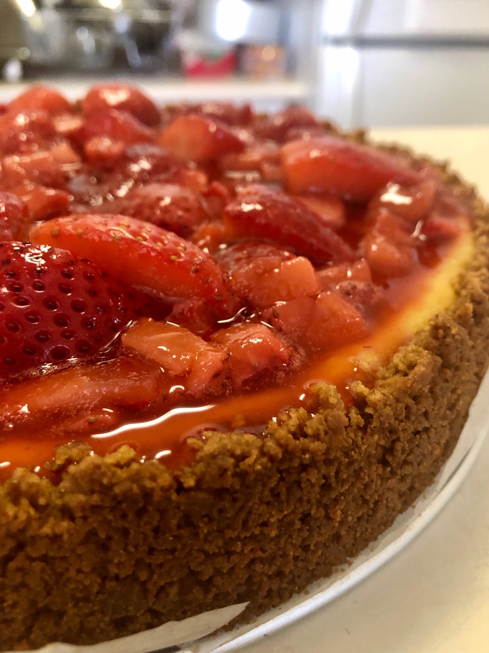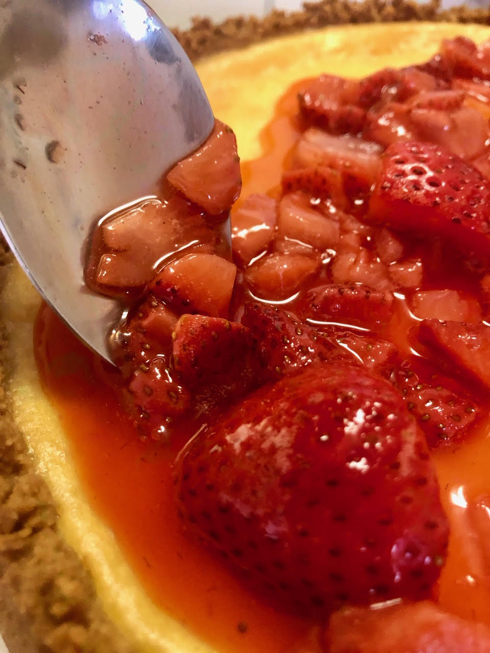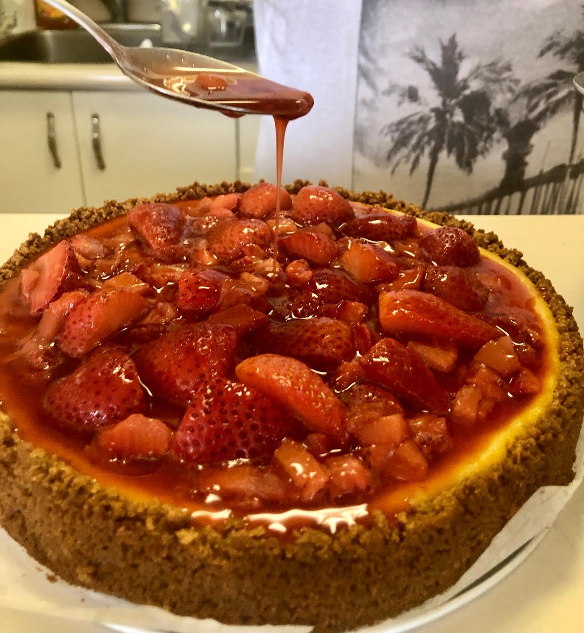 The result? A light, creamy cheesecake with a sweet strawberry glaze that will test your temptation while it’s still cooking.