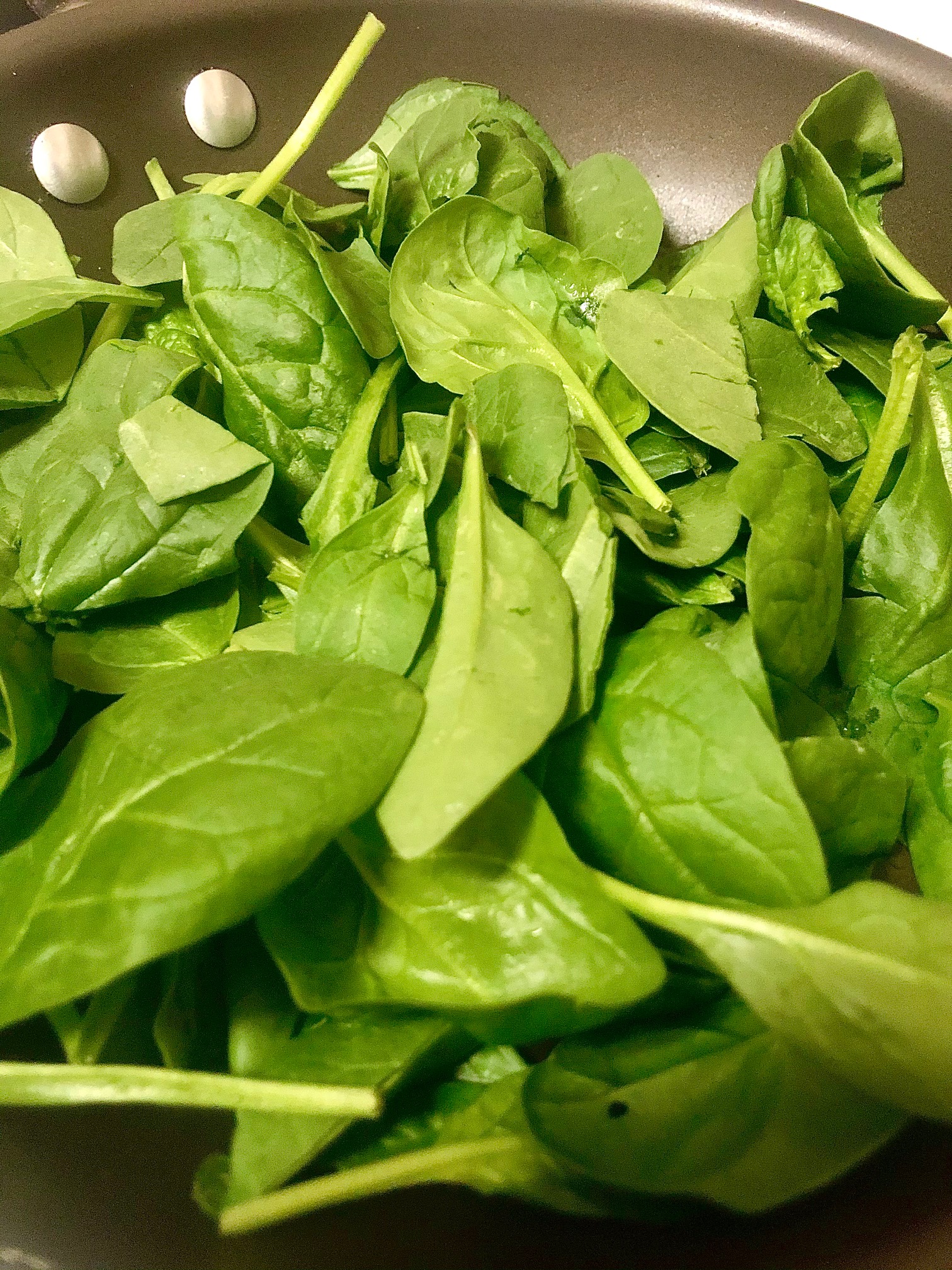 - While this is cooking, drizzle a small pan with olive oil and cook the spinach on medium-hight. This should take about 3-5 minutes.