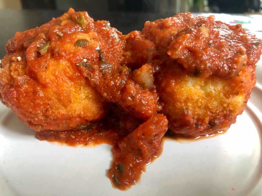 Arancini, or rice balls, can be a delightful appetizer or in my case, a midday snack. It has everything that’s good — rice, cheese, seasoned breadcrumbs and tomato sauce.