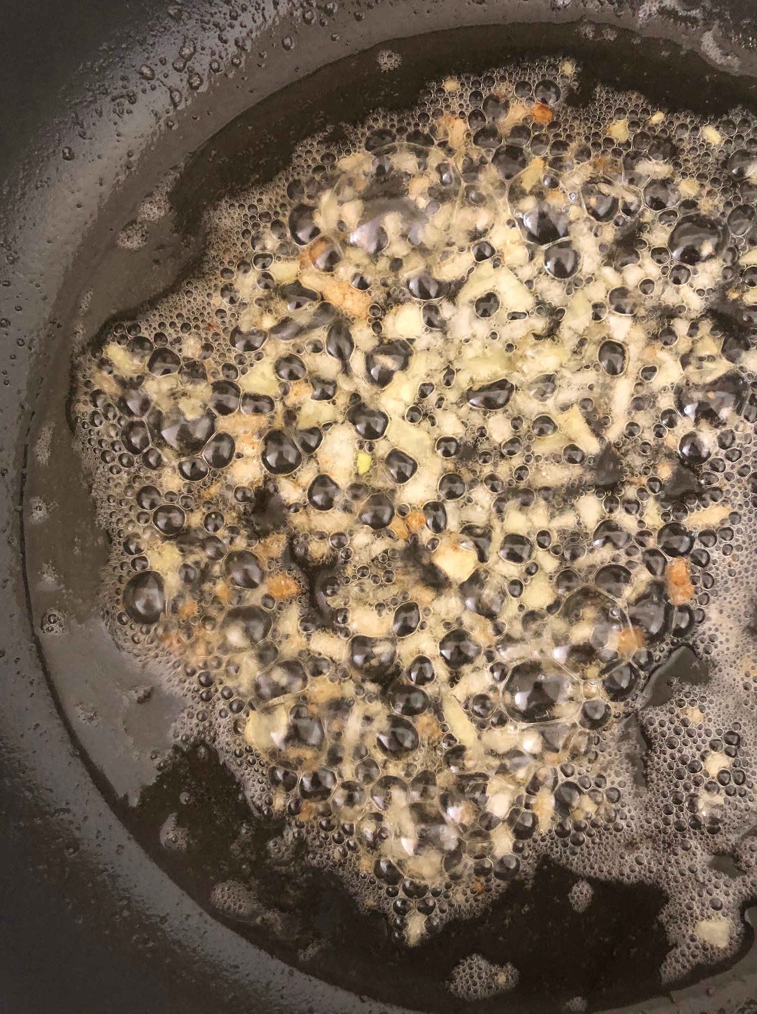 - In a large pan drizzled with olive oil on medium-high heat, add the butter, then add the chopped onion.