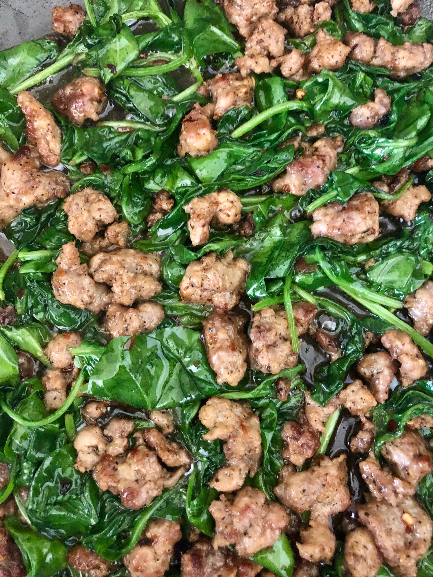 - Once the sausage is cooked, add the baby spinach to the large pan and let cook until the spinach is dark in colour and has shrivelled up.