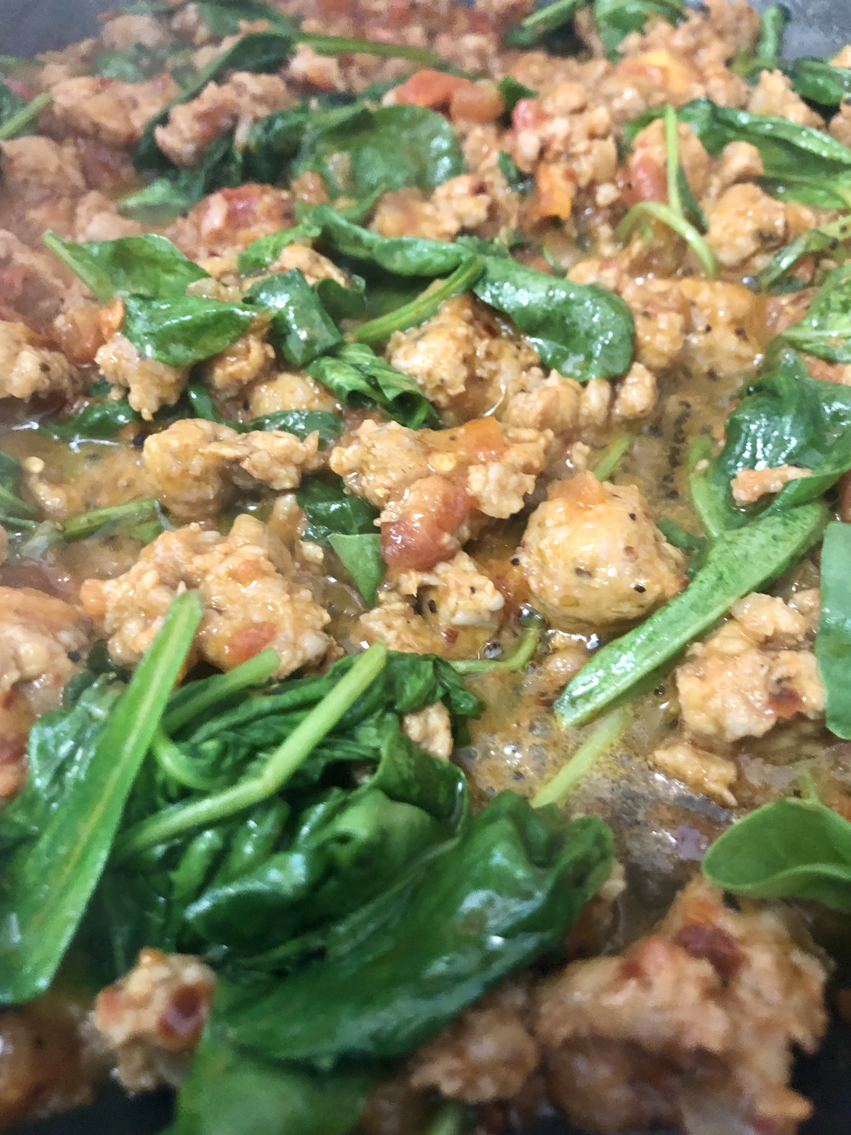 - Once the sausage is browned, add the spinach to the pan. Mix the spinach with the sausages and vegetable base. The spinach should shrivel up, and it should take about 3-5 minutes to cook.