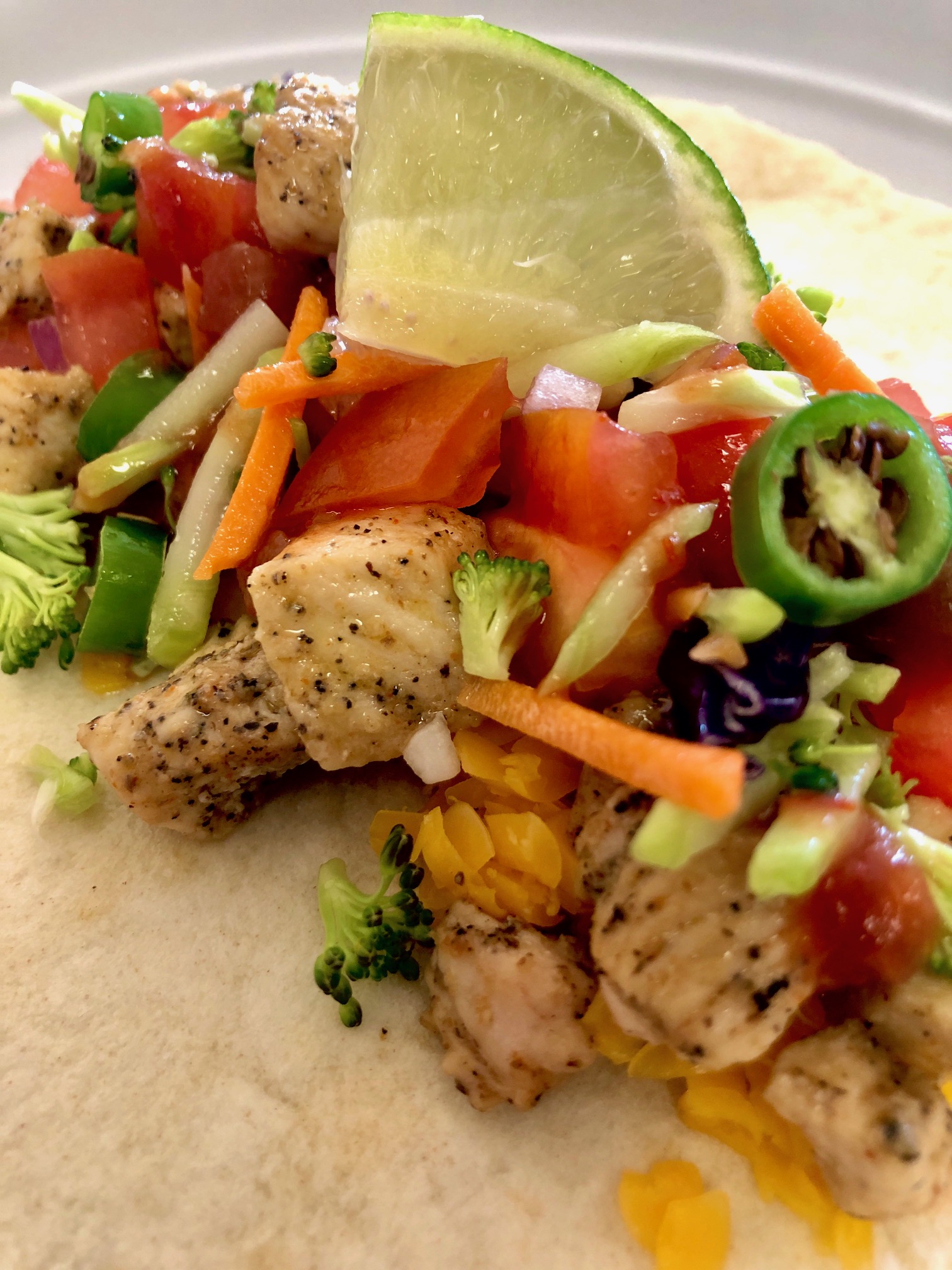 - Drizzle olive oil over the coleslaw and mix until well combined. Once the chicken is cooked, warm the tortillas in a small pan on low-medium.