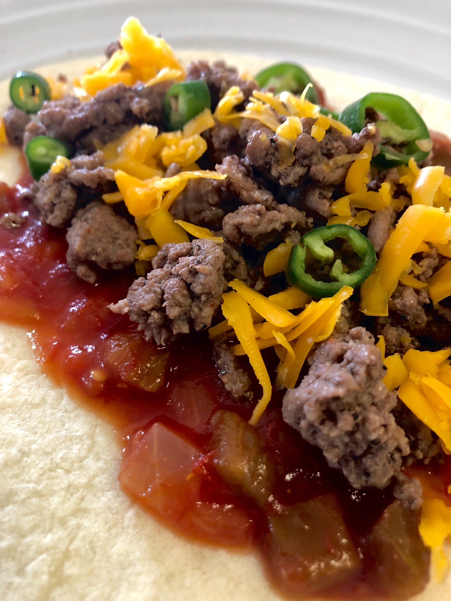 - Chop the jalapeño peppers and shred the cheddar cheese. Prepare the salsa and, once the beef is cooked, warm the tortillas is over low-medium heat in a small pan.
